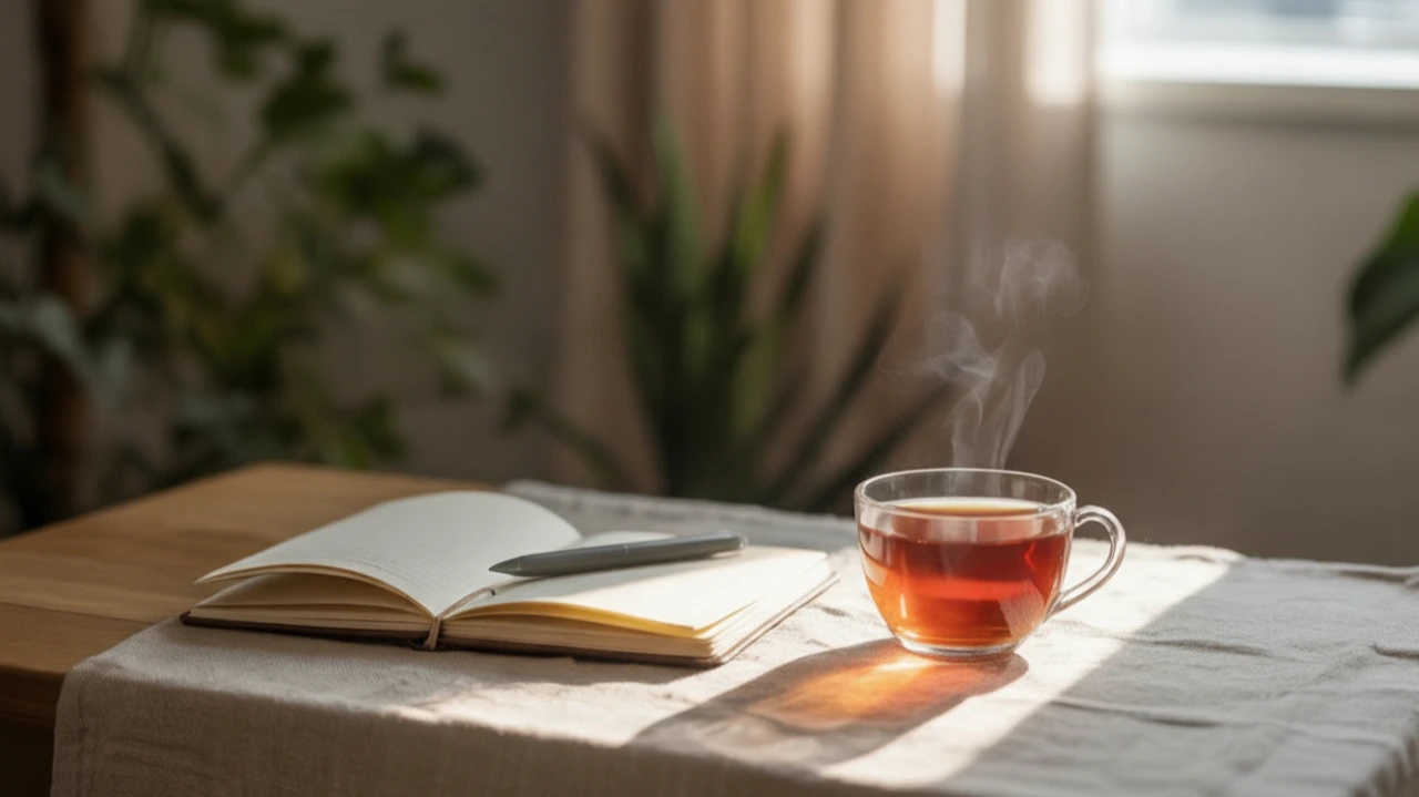 A warm, sun-lit minimalist space capturing the essence of slow living: a cozy wooden table with a steaming cup of coffee or tea, an open book, a small plant, and soft fabric textures. A person is present only partially—hands, silhouette, or back turned—engaged in a slow, mindful moment like journaling, sipping tea, or gazing outside. Include gentle morning light streaming through a window, creating soft shadows. The atmosphere should feel calm, intentional, unhurried, and deeply peaceful. Neutral, earthy color palette. No clutter. High-quality cinematic lifestyle aesthetic with clean space for title text overlay.